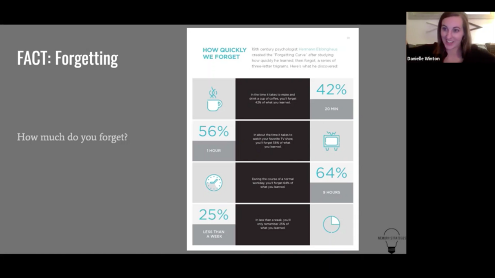 Danielle Winton, owner of Memory Strategies, has taught abroad, in the States, and online for over 10 years. She is dedicated to bringing effective methods of learning and studying to students and professionals. Her 90 minute 'Memory Strategies Workshops' have doubled test scores in record time by employing effective methods of learning and memory.